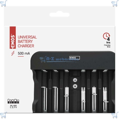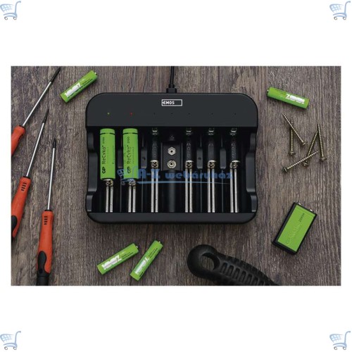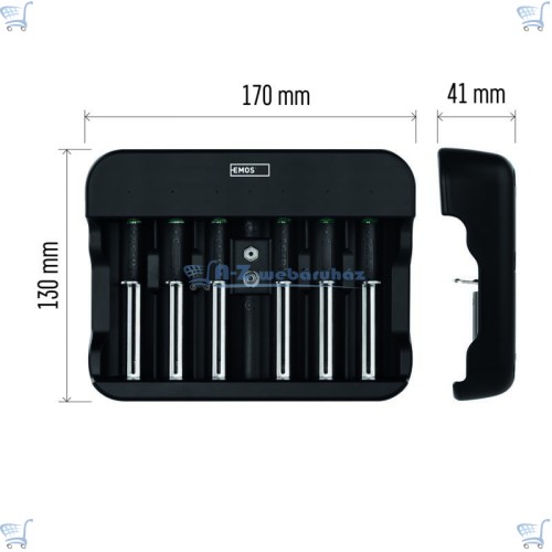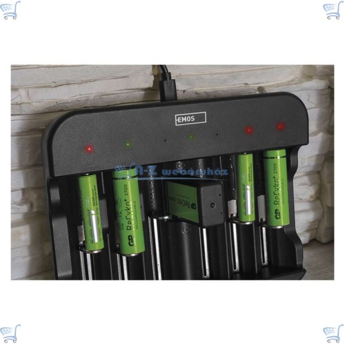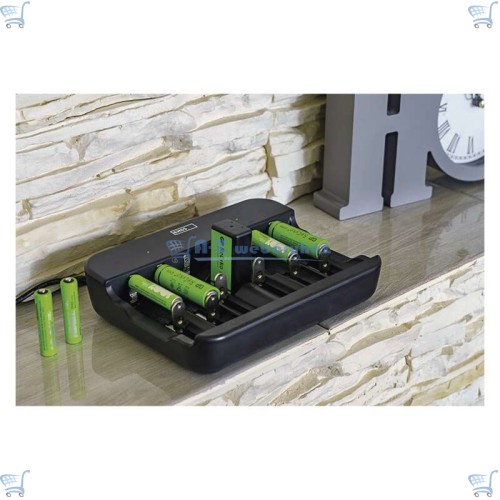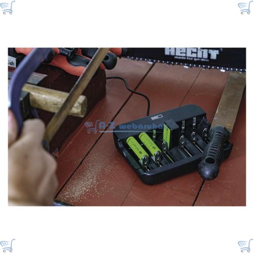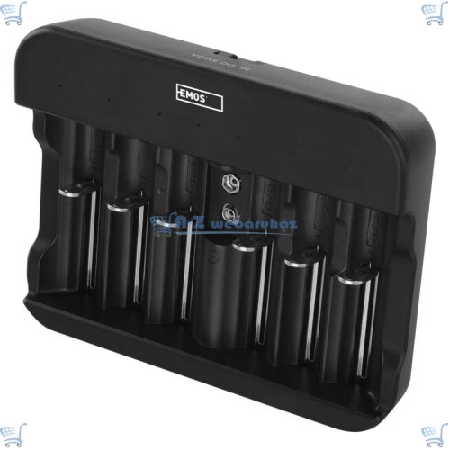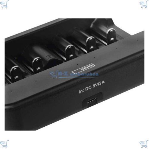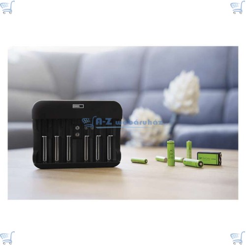 Intelligens univerzális töltő AA, AAA, C, D és 9 V újratölthető NiMH akkumulátorokhoz, akár 7 különálló töltőcsatornával. A töltés folyamatát LED-ek jelzik.